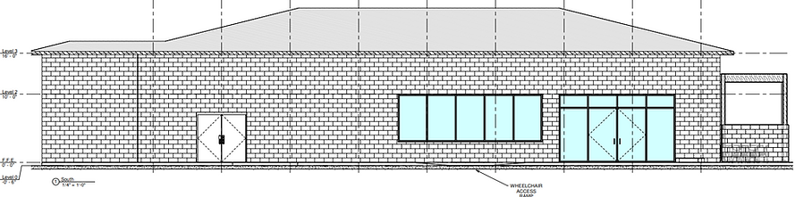 South elevation — facade composition, masonry assembly, glazing layout, and level annotations.