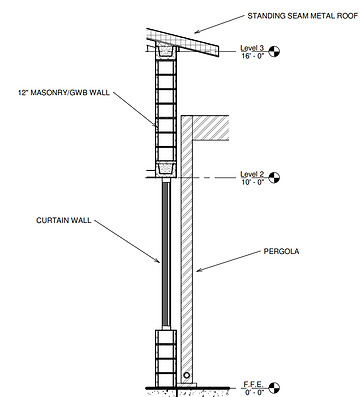 Southeast wall section — standing seam metal roof, 12" masonry/GWB wall, curtain wall, and pergola connection at level annotations.