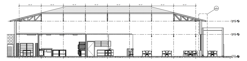Building section — spatial relationships between dining and service areas, roof structure, and ceiling heights.