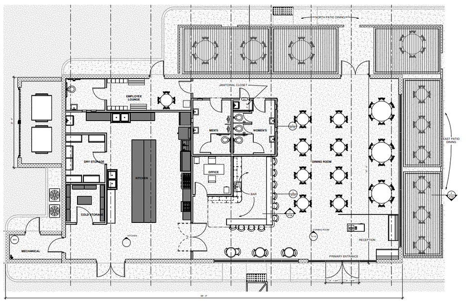 One-story, 4,000 SF commercial restaurant layout developed in Revit. Organized front-of-house and back-of-house functions to support circulation and service flow.